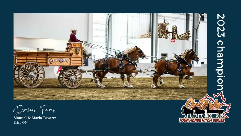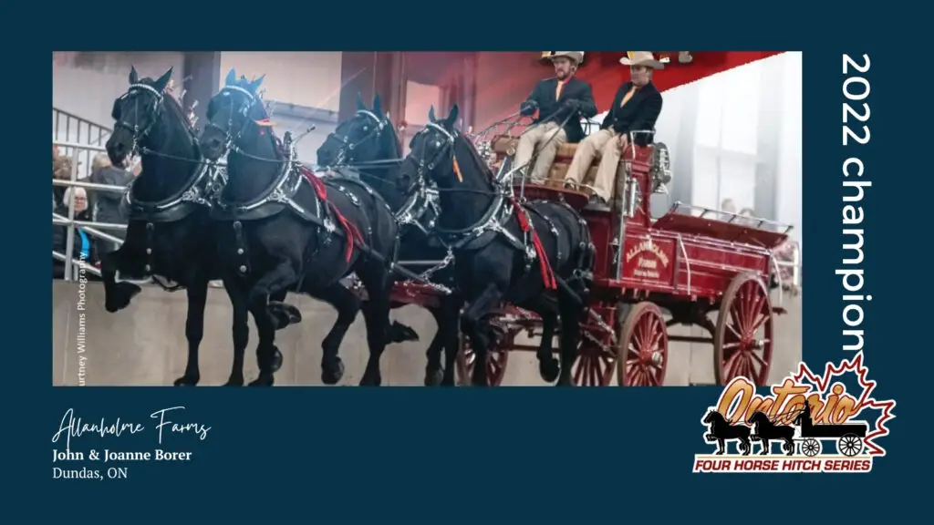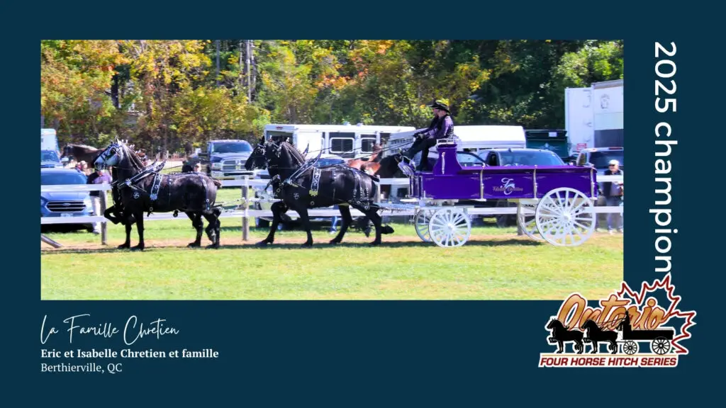 Welcome to the Champions Wall of Fame, a tribute to the magnificent teams and dedicated drivers who have claimed the most coveted title in the Ontario Four Finals. This prestigious competition showcases the unparalleled strength, elegance, and synchronized teamwork of the finest four-horse hitches from across Canada and the United States. Since 2022, the Finals have determined the elite champion of this celebrated series, judged on the horses’ appearance, motion, harness, overall presentation, and the driver’s skill. Below, we proudly feature each winning team and driver who has earned their place in our history, allowing you to ‘feel the thunder’ of their enduring legacy.